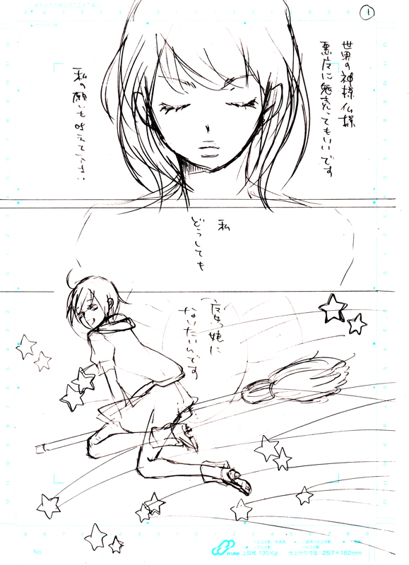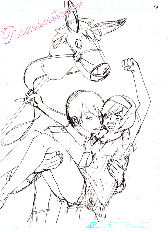 2009/04/04 Category : 絵日記 ロマンティッカー 先日なんとなく描いた女の子が気に入って、この子を主人公に漫画を描きたいな~なんて思ってとりあえず原稿用紙を買ってきてみた。そしてさわりをちょっと描いてみた。超電波。一応タイトルはロマンティッカーなんだけどもう「超電波」でもいい気がしてきた。ちなみにこの女の子は成人済です。いい年こいて!アホだね!!友人が家に遊びに来た時に(酒を飲みながら)一枚目を描いたんだけどなんかもう素敵に電波になってしまいどうしようやっべー!!とか爆笑しつつ騒ぎ尽くして放置していたのですが、妄想が止まらなくなって来たもので表紙まで描いてみたら色々膨らんできたので今頑張って続き考えてる!上手いこと昔考えたネタの焼き直しが出来てきたので頑張れば完結するかも。ていうか完結させたい…しかしオリジナルの少女漫画って自費出版だとニーズが低そうって言うか誰か読むのか?みたいな気もしてきたけどまぁいっか…私の漫画は自己満足の世界だし…しかしどんな作品だろうと、たくさんの人に読んでもらいたかったら実力つけるしか無いよな。頑張ろう。久々に漫画描くのが楽しい時期みたいなので、今この時を逃さずに頑張りたい…遅筆なものでテンション維持が難しいんだよなぁ。そんな訳でノーマル漫画のサークルも勃発しそうな勢いです。ボラ?ボラも描くよ!頑張るよ!時間が足りないのでコピーロボットが欲しい。そしたら少女漫画もボラ(BL)も同時進行で描けるのになー。あー楽しい!
