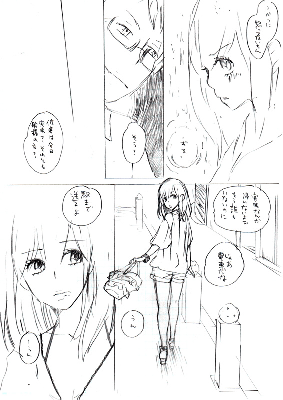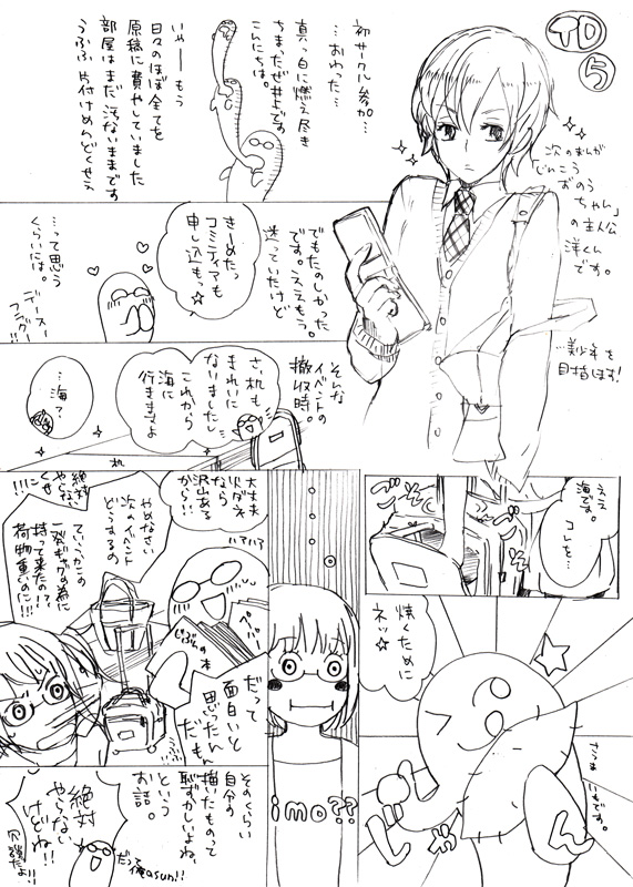 2009/09/14 Category : 絵日記 いのちだいじにがんがんいこうぜ 部屋の掃除が全然出来ないので気分転換に絵日記。もちろんこんなことしてる場合ではない。ていうかそろそろ寝ないとやばいね!いつものことだが、特にオチない。おばけ自画像じゃないだけで感じが変わるなぁ。これ描くのも痛かったんだけどもう仕方ないかな~と思って突っ走ってみた。鉛筆の段階はまだいいんだ、ペンもたぶんまぁ…使うペン変えればなんとかなりそう。問題はトーンなんだよなぁ…私はトーンが一番腕やられます。早くPC導入したい…あと、今日久々にいっぱい料理したら、筋力の衰えが著しくてびびった。ここ二ヶ月くらいほとんど料理らしい料理しなかったから無理も無いかもしれないけど人としてアレなので、次の修羅場はほんと出来るだけ余裕を持とうと思いました。自分で作るご飯はやっぱ美味しいしね。そしてやっとコミティアの申し込み書き上げたよ!サークルカットを描くのにも段々慣れて来ました。頑張ってこのクオリティを保って本文のペン入れしたいなぁ。それには時間に余裕が必要ですうん分かってる分かってる。…いつも何故こんなに修羅場になるんだろう…一人暮らしだからなのかしら、誰もいないとダレるよね。誰かOTAKUメイトとルームをシェアリングするのが私の夢です(まだ言ってる)、今回コミティアはまじで一人サークル参加の予定なので超緊張します。でもグッコミで大体感じはつかめた気がするしその前にJ.GARDENもあるからもうちょっと慣れるだろうし紙と鉛筆さえあれば暇はしないので特に問題は無かろうよ、と思って申し込みしちゃいます。楽しみだ!