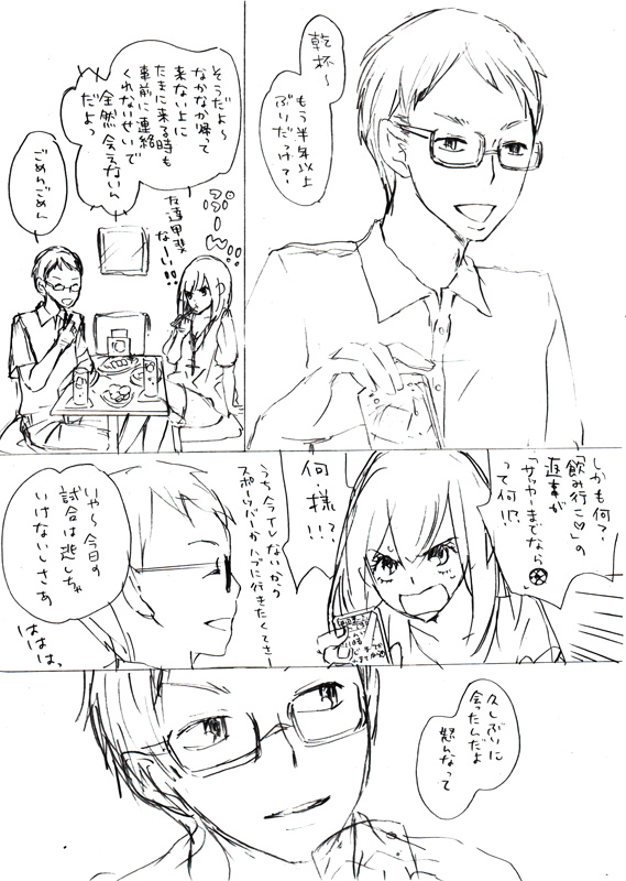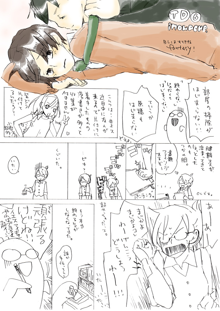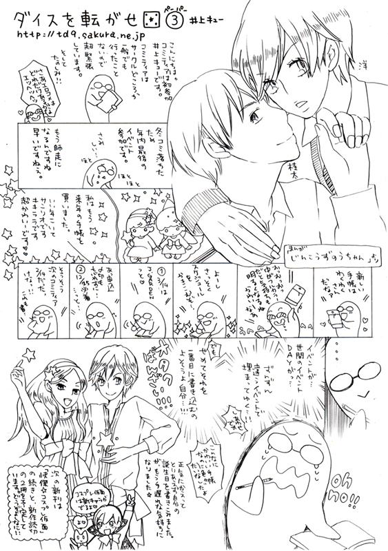 2010/01/17 Category : 絵日記 しょうもないペーパー御披露 2009/11/15のCOMITIA90にて配布したペーパー公開!おもて!うら!!ひどいほんとひどい見せた友達には指差して爆笑されました畜生!ほんとこのネタ描いたときは自分が天才になったかと思った まぁ気のせいですけどアホの極み、みたいなネタを思いついたときが一番テンション上がります。もっと!もっと極めたい、メーターを振り切りたい、ピリオドの向こう側に行きたい!!とかもんもんしながらいつも漫画を描いています。たのしい。漫画楽しい、といえば、素敵な企画が持ち上がりました!五月のコミティア、いつものBLではなくSF・ファンタジーにてサークル参加することになりました!お友達二人との合同サークルです、うふふふふ楽しみいいい!久々に男女の恋愛モノをかくぞー!!うきうき!!と、意気込んでいます。色々固まりましたらまたアナウンスしますので、しばしお待ちを!ああ嬉しいな 新しいことを始めるっていい刺激ですよね。血が沸くぜ。しかも私の大好きなお二方の漫画が読めるなんて鼻血ふばはあああああああ!!!って感じですうへへへへ!原稿頑張ろう!うんほんと原稿頑張ろう…なんか最近仕事が忙しくて、11時までやってる駅前のスーパーが開いてる時間に帰れなかったりして凹みます。こんなにおうちが大好きなのに!…仕事頑張ろう。