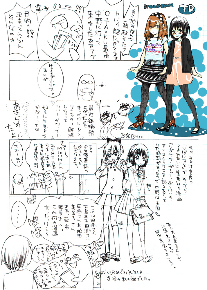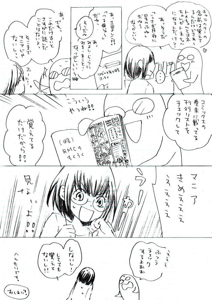 2010/06/27 Category : 絵日記 中野日記やっと進んだ 先日中野に行った時の小噺諸々がけっこうあるんですけど、なかなか描く暇が無い。女の子複数、らくがきじゃなくて漫画形式で描こうとするとけっこう時間がかかります。今回は一枚目の、タイトルのところと、水沢めぐみ先生のキャラ(朝子&姫子)にすっげえ時間取られた。書き終わらないんじゃないかって思った。特に人様のキャラクターは時間がかかります。漫画に関しては、もう、北島マヤ級に力を発揮します。ことりぼんを筆頭とする集英社系の漫画の無駄知識がすごいです。昔、集英社でデビューしたくてけっこう色々調べていたせいか、超色々覚えている。今一人暮らし中なのですが、蔵書はほぼ実家におきっぱなし(場所が無いので)で、ここ数年全然読み返してないのに、けっこう覚えていて自分が気持ち悪かったです。でも楽しーなぁー漫画!80年代のりぼんマスコットコミックスたち&ぶ~けコミックスの純情クレイジーフルーツは私の宝です。