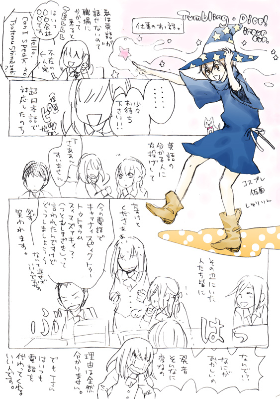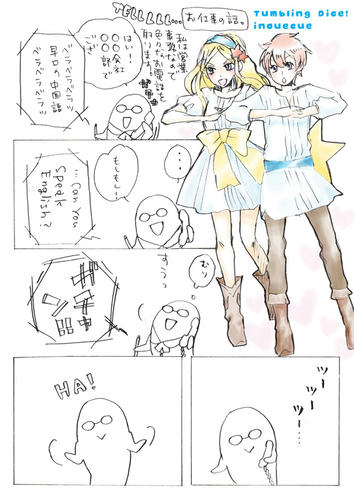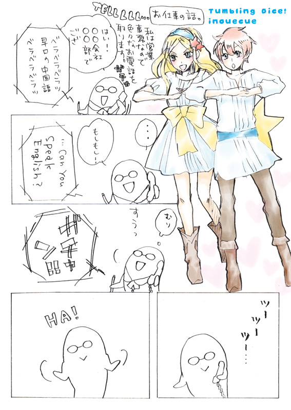 2010/08/22 Category : 絵日記 職場にかかる電話 私の仕事はほとんど国内企業とのお取引なのですが同じ部署内で海外向けを扱っているチームがあるのでたま~に英語とか中国語で電話がかかってきます。頑張って再現したら超笑われた。英語って難しい。あ、つとむしまざきはもちろん仮名です。