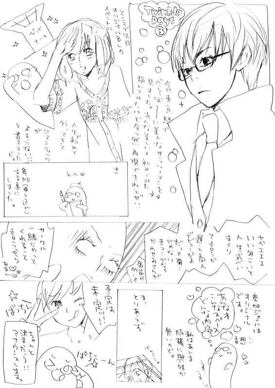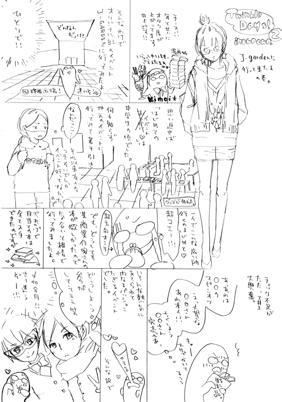 2009/03/23 Category : 絵日記 なんでこんなに楽しいんだろう えー、上手く行けば今年10月のイベントに友人とサークル参加します。これから本格的に話して口説くので、上手く行くか予定は未定…!前回の絵日記(J-GARDEN参加)から実際申し込みを決めるまでは2週間くらいのタイムラグがあると思ってください。私はわりと筋金入りのOTAKUですが、NLでもBLでもギャグでも版権もの二次創作をすることに全く興味が無かったため世間一般で言うところの腐女子活動はあまりしたことが無い(わりと少女漫画寄りにいたし)のでとても楽しみ!昔は漫画描くって言ったら全部投稿用作品だったから同人誌にする必要が無かったんだよね。二次創作にも憧れるんだけど、他人のキャラを描くのは苦手なんだ。別物になってしまうんだもの。OTAKUに産まれたからには一回やってみたいんだけどこの先も難しそうだなー。いっぺんオフで漫画作ってイベント行ってみたかったんだよなあぁ~。ちゃんと本にするのなんか大学のサークル以来なのでうきうきして仕方ない!創作サークルに在籍して学校の印刷機で自分達で漫画作ってたんだけど、無料配布だけで販売はしていないから全然勝手が違いそうううう怖い でも楽しみだ!BLとか書いたこと無いんですけど大丈夫やればできるぜ!という気持ちで友人を口説きに行ってきます。
